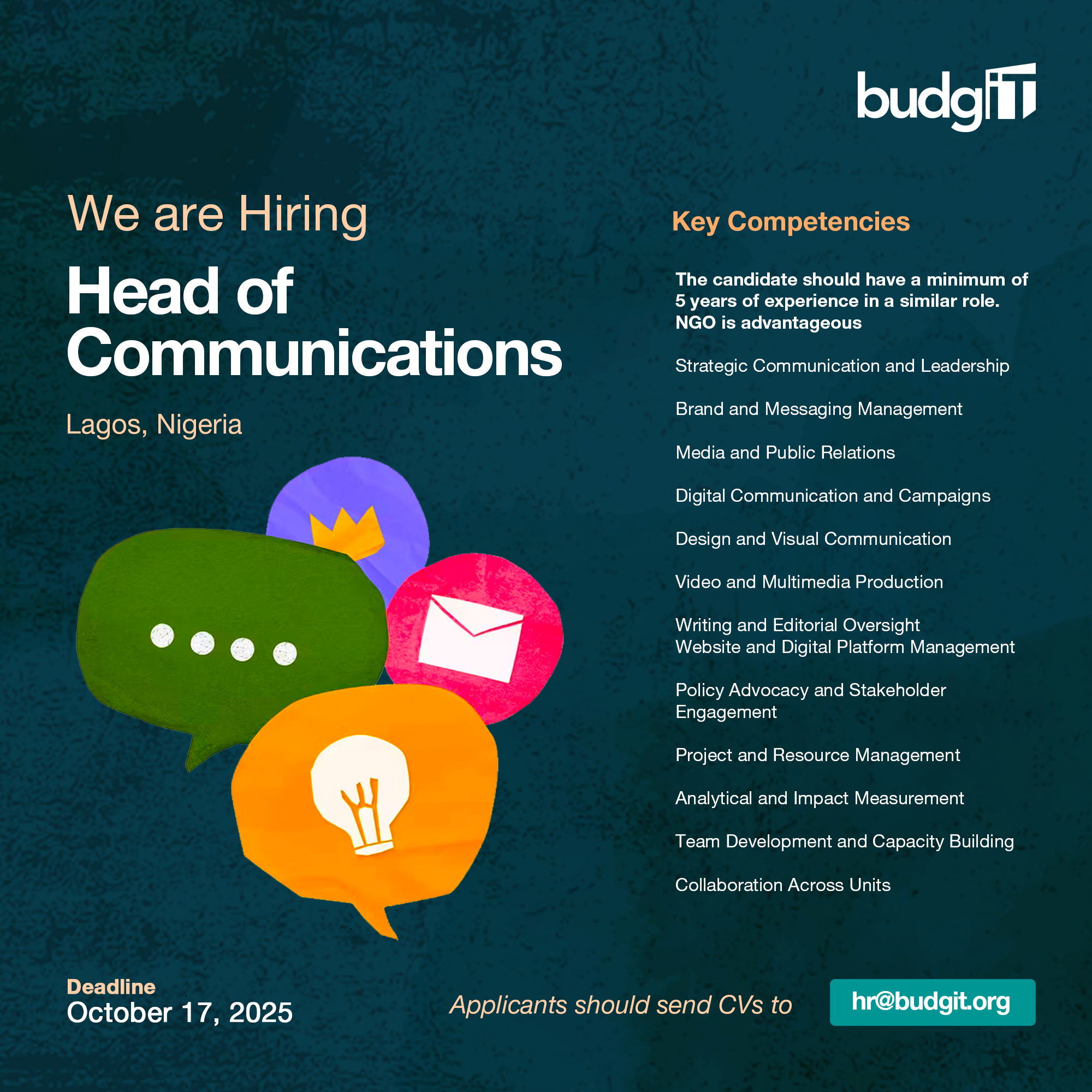 – Ability to design and implement integrated communication strategies aligned with BudgIT’s mission and campaigns.